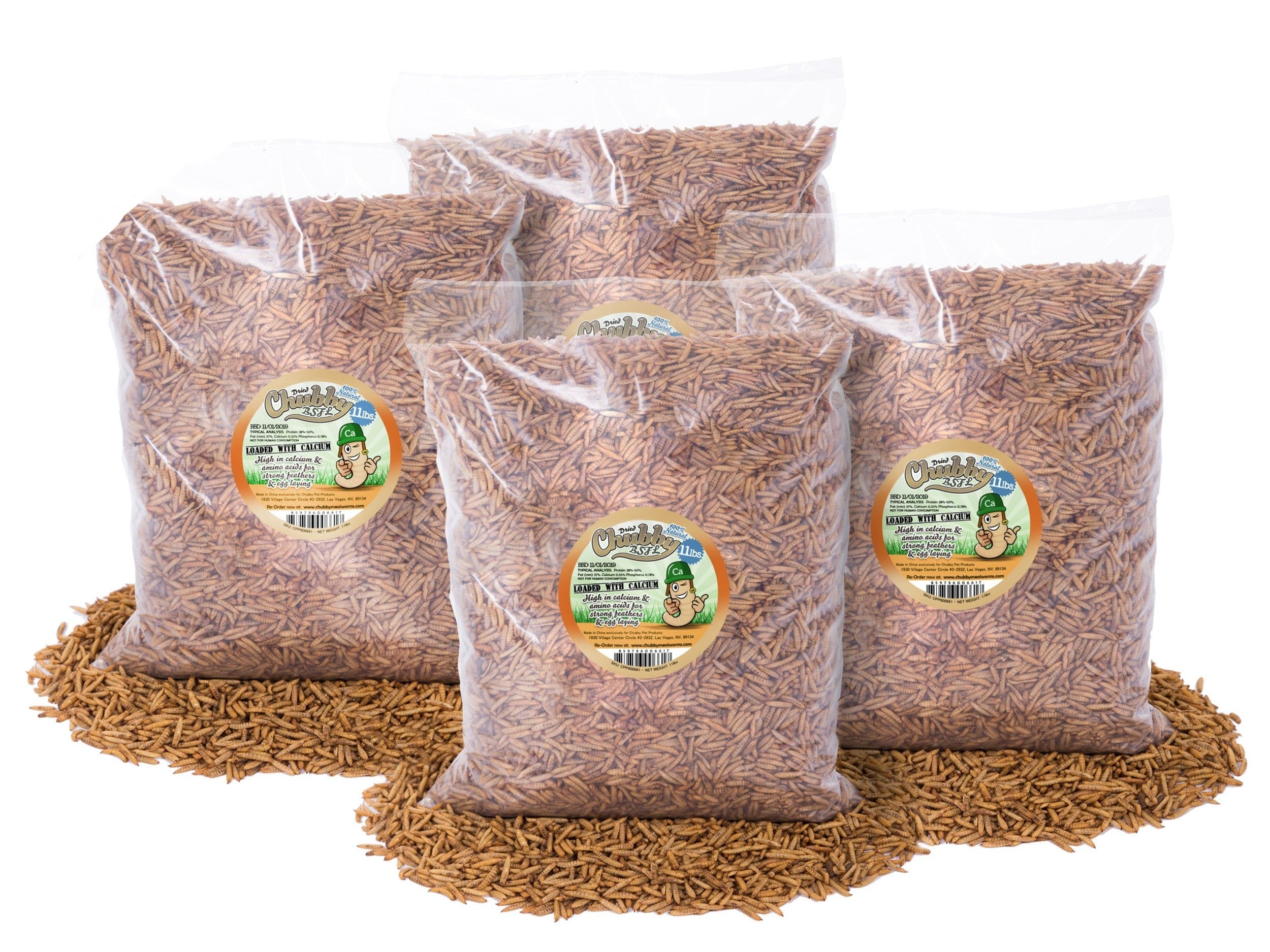 44lbs of Chubby Dried Black Soldier Fly Larvae come packed in a 4x 11lb clear plastic bags.